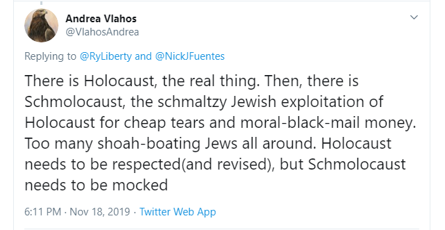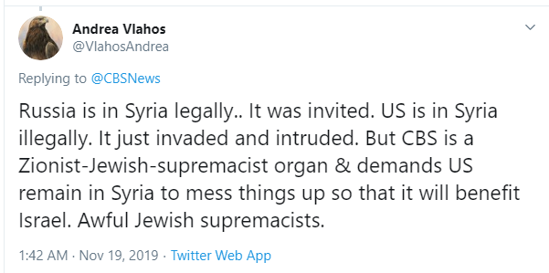 Twitter, Cravenly Toeing the ADL-SPLC Line, Bans Andrea Vlahos for Speaking Truth to Yinon-ist Jewish-Supremacist Globo-Homo Power
